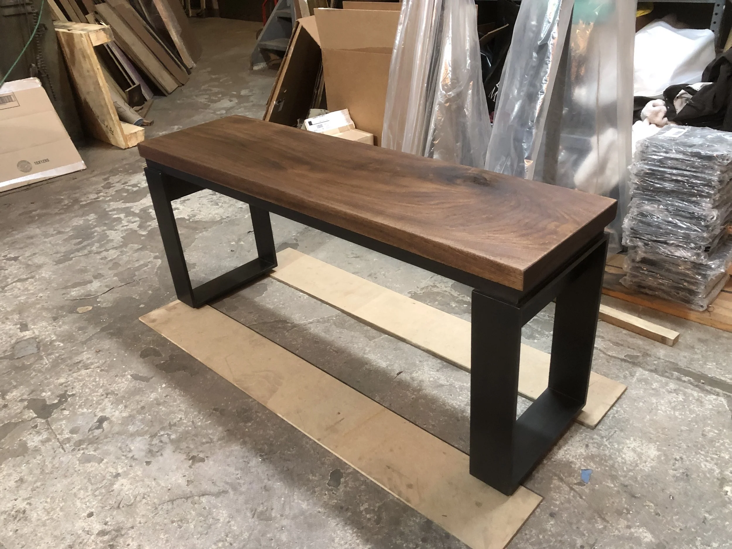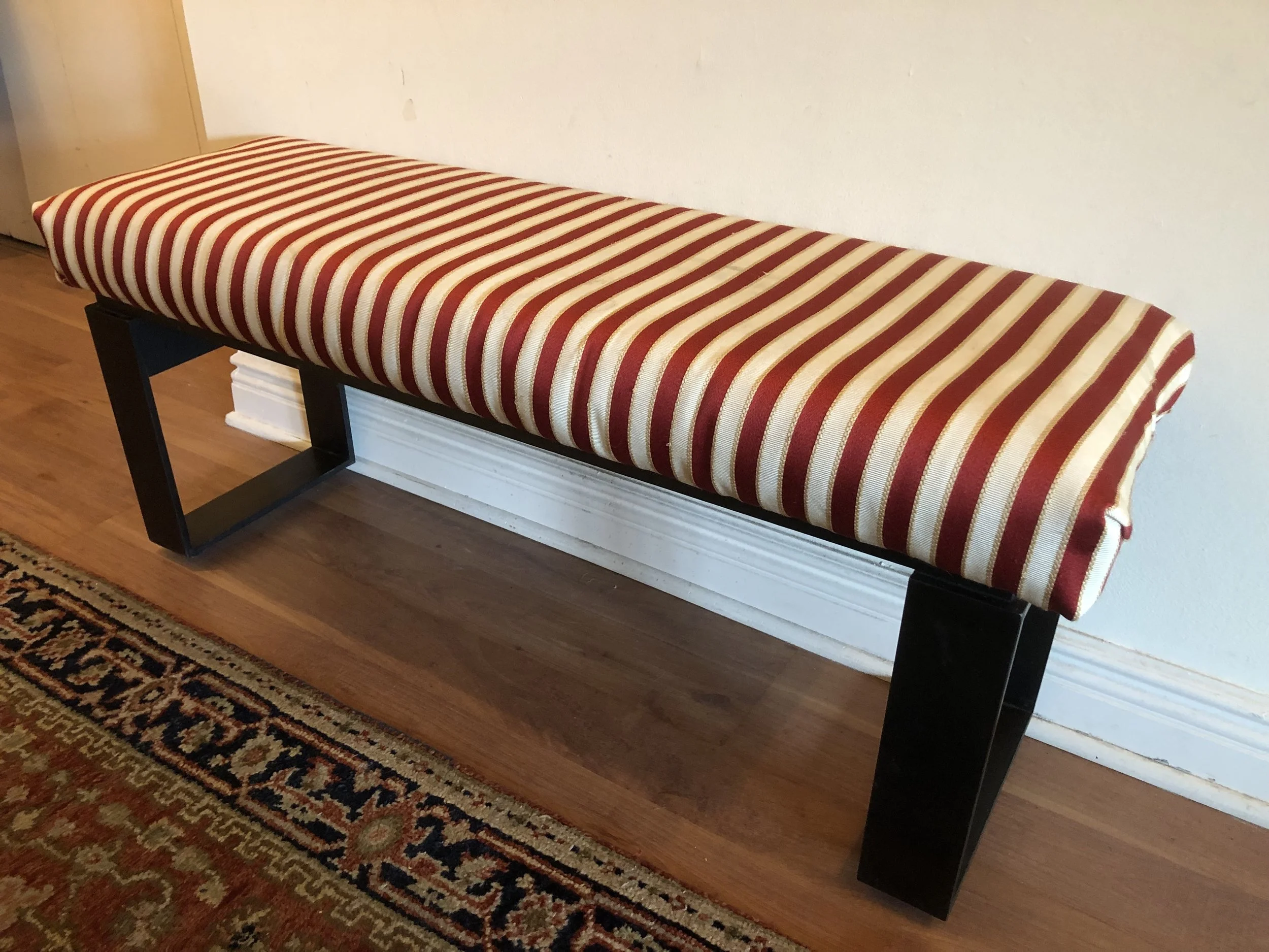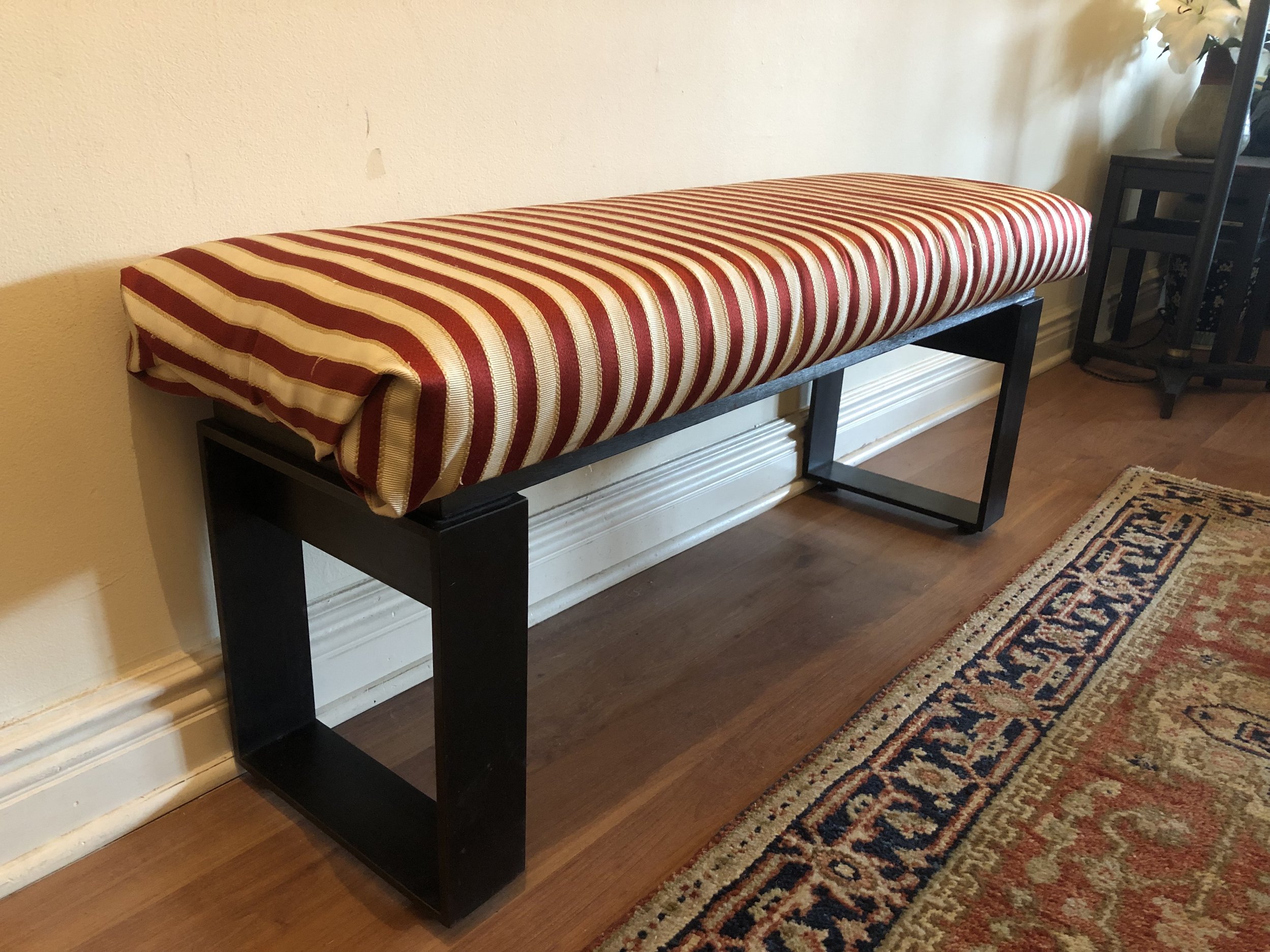 Made with NYC in mind, this bench is slim enough for the hallway, but deep enough for your respite from the busy streets. Made from steel, with brass feet and depicted here in Statuary Bronze with a custom striped cushion or finished walnut top. Custom sizes are available to conform to your hallway.