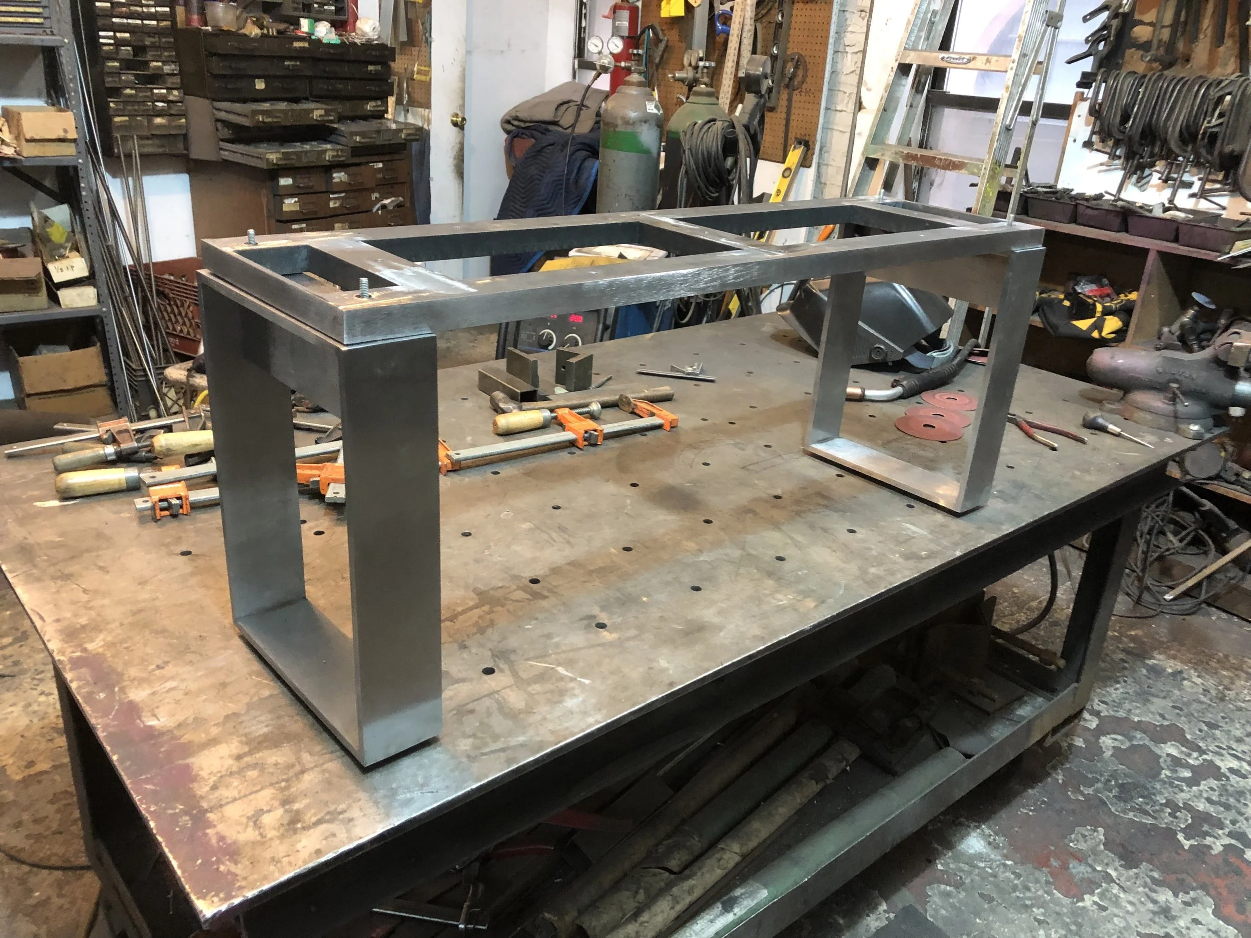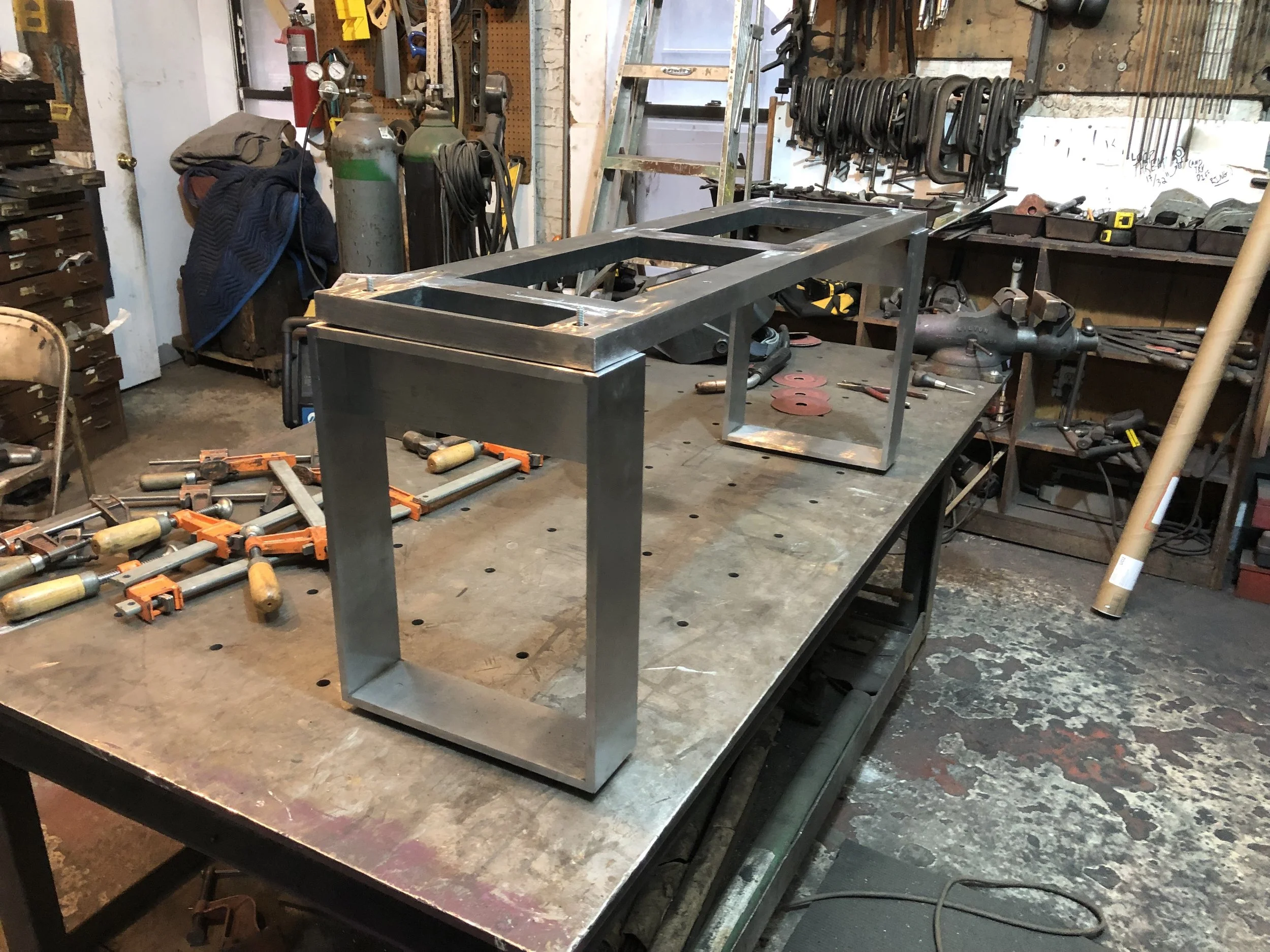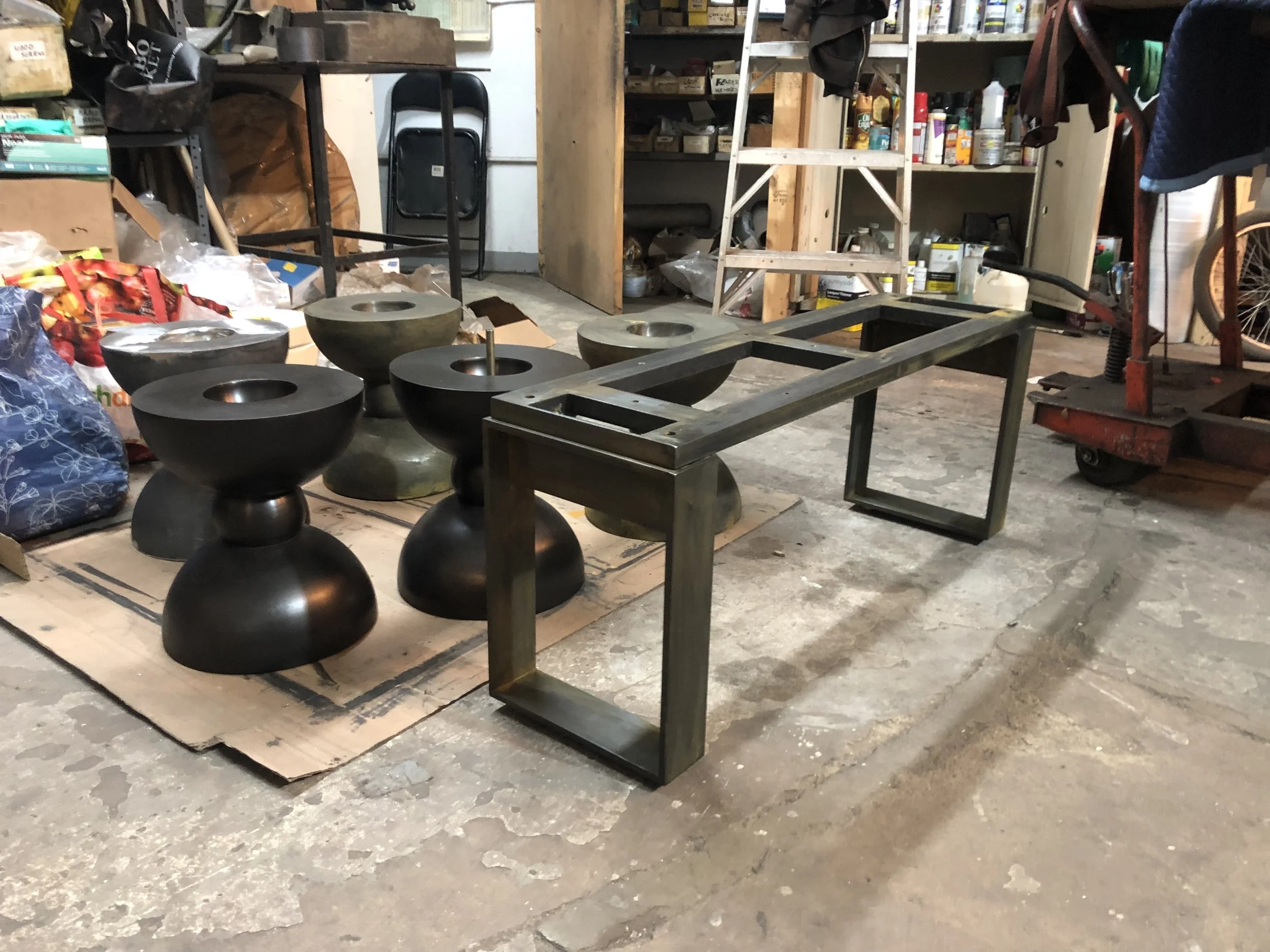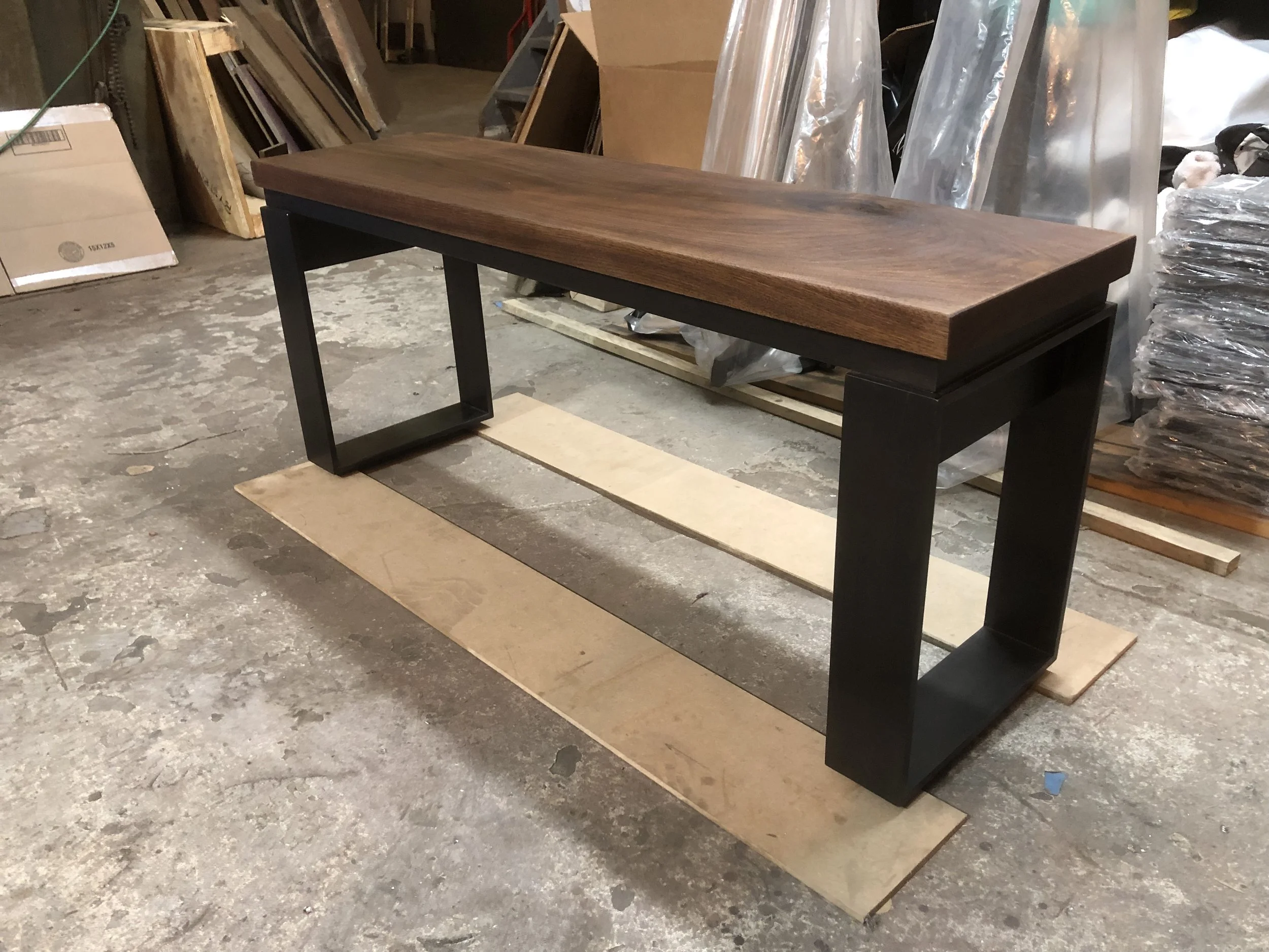 Made with NYC in mind, this bench is slim enough for the hallway, but deep enough for your respite from the busy streets. Made from steel, with brass feet and depicted here in Statuary Bronze with a custom striped cushion or finished walnut top. Custom sizes are available to conform to your hallway.